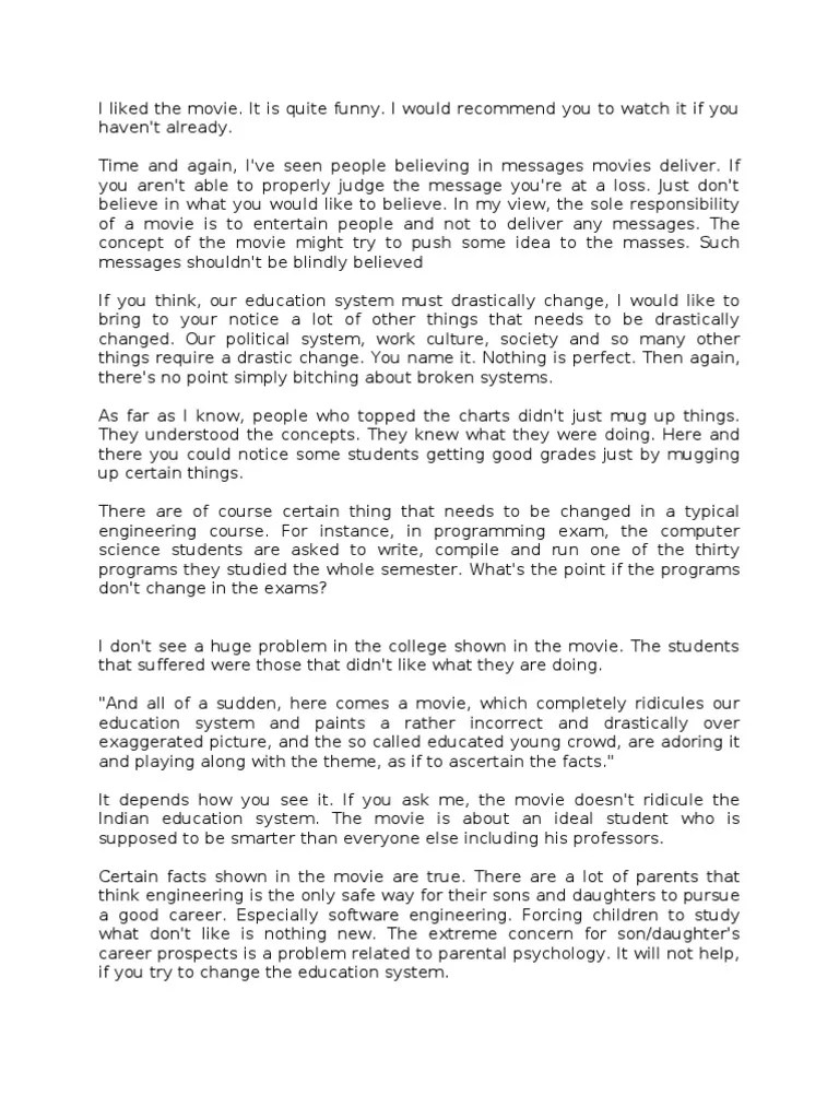 3 idiots movie review essay in english. This movie teaches us running after excellence not for success. 3 idiots last saturday we watched an indian movie entitled 3 idiots. 3 idiots film review pages. Many people already told me that the move is worth watching for but i.